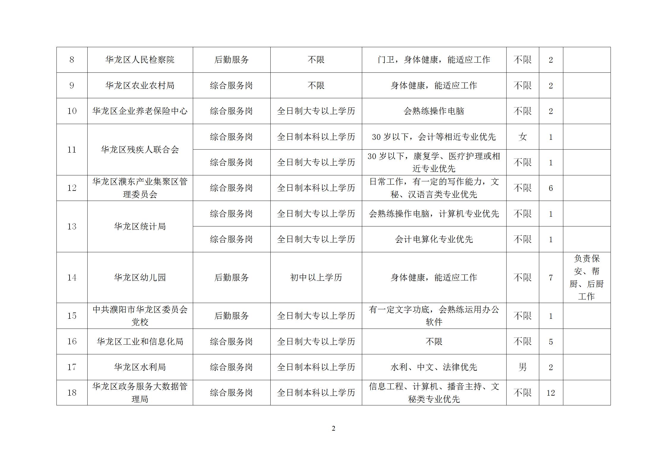 華龍區(qū)范圍內,持有《就業(yè)創(chuàng)業(yè)證》、已進行失業(yè)登記,并經我區(qū)認定的符合《河南省公益性崗位管理辦法》規(guī)定的就業(yè)困難人員,且滿足以下條件: